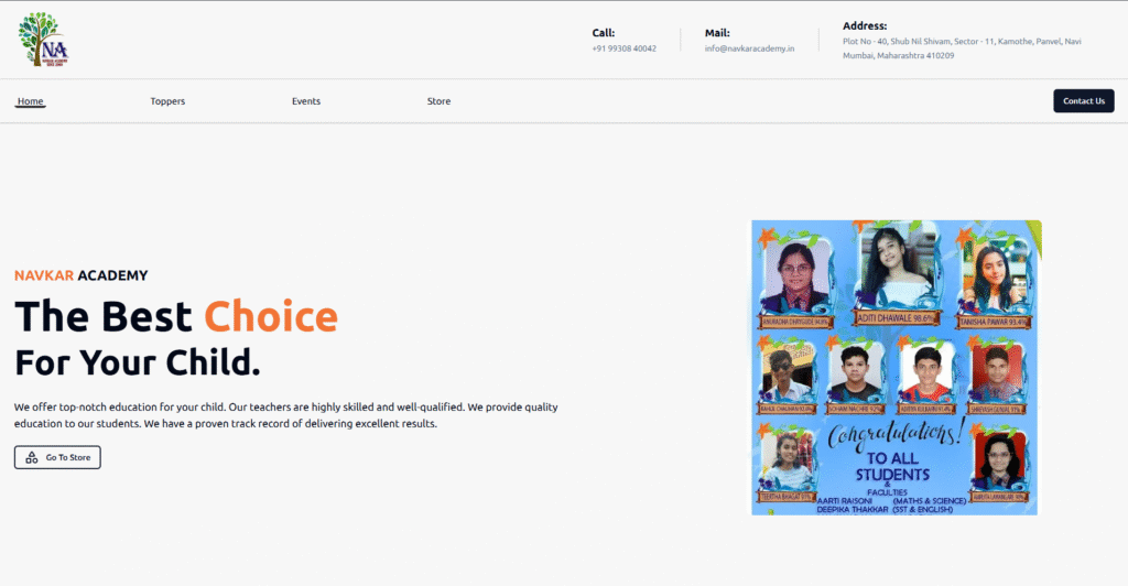 The tuition classes website in Byculla displays their class information their toppers, and events. This also has a complete admin panel with all the management tools built for their classes.