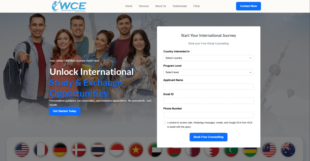A custom landing page for Wisdom Career Education (WCE) to generate leads for their page and notify admins via email using a simple automation.